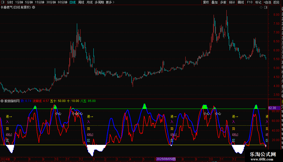 卖出/警示信号:当“决策线”自上而下穿越80时,会显示“小心”文字,提示可能进入高风险区域。