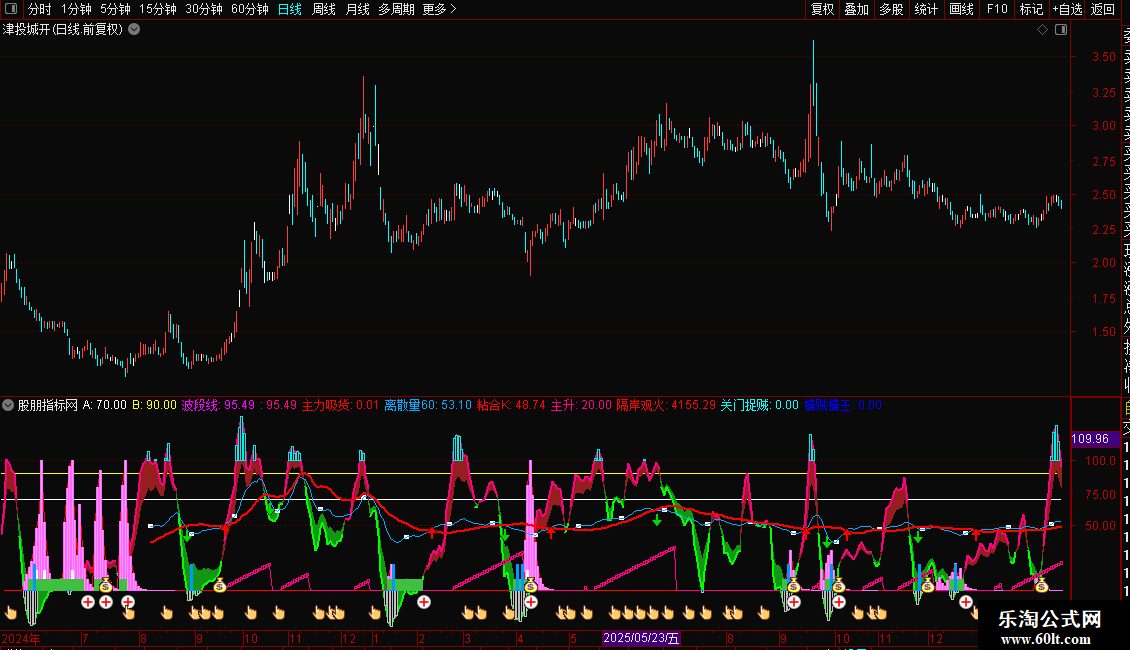 4、红箭头买进提示,绿箭头卖出提示。钱带子、红十字是买进提示。向上的手指是短线买进提示,一般持股3-5天。