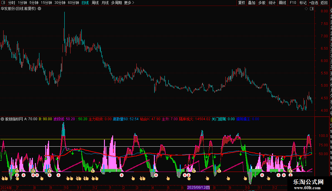 3、90以上的兰色和绿色柱是顶部提示,但出现兰色柱后,红色波段线在85以上,同时粘合k线持续上升,则可以持有,股价还有相当的上涨空间。