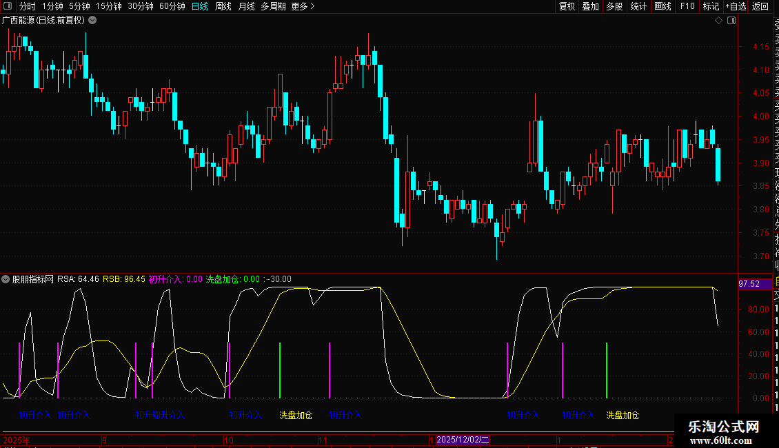 “初升介入”信号:当RSA上穿RSB时触发,提示可能的趋势启动点。