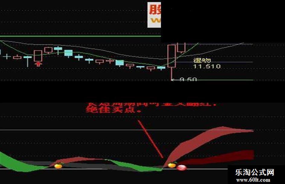 淡红色带表示短周期向上,绿色表示短周期向下,金桔子表示金叉拐点。