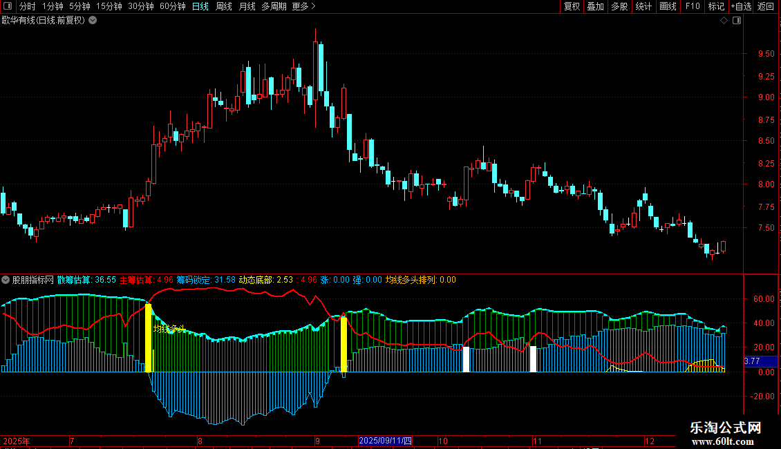 散筹估算:EMA((WINNER(C*1.1)-WINNER(C*0.9))*70,3),LINETHICK5,COLORFFFF00;