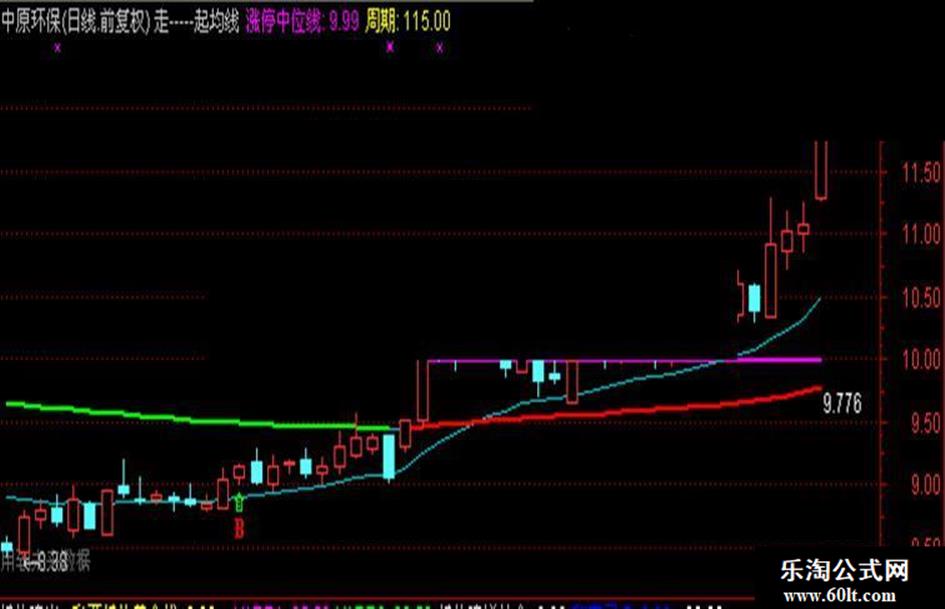 涨停中位线:DRAWLINE(DF,Z,REF(DF,1),REF(Z,1),1),COLORMAGENTA LINETHICK2;