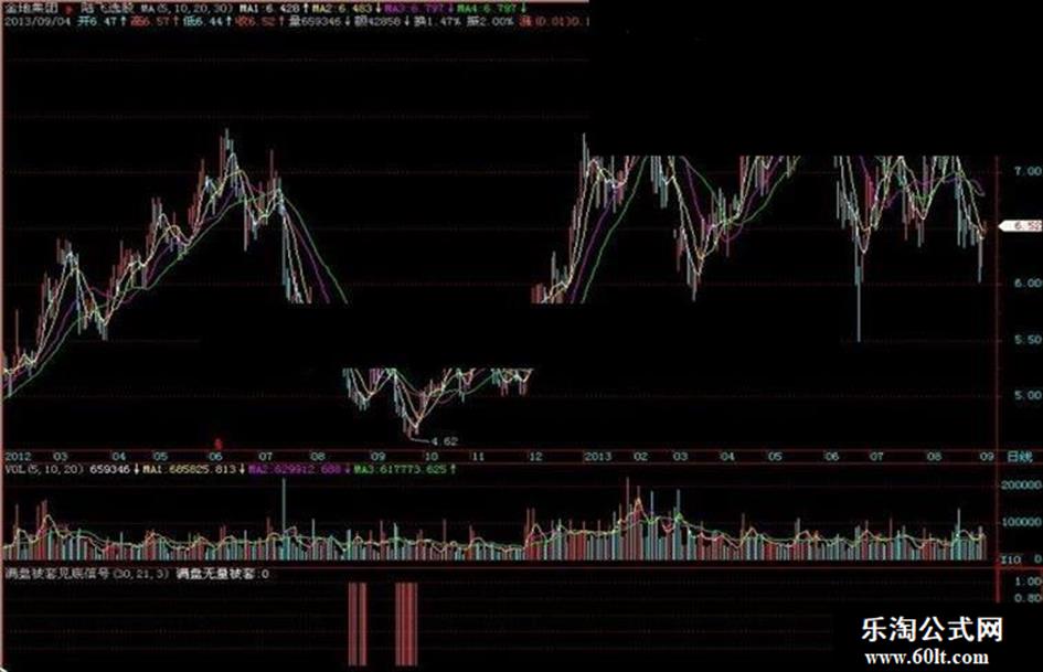 满盘无量被套: IF(close>0,IF(WINNER(CLOSE)*100<10 AND Var2<=4,1,0),0), COLORSTICK;