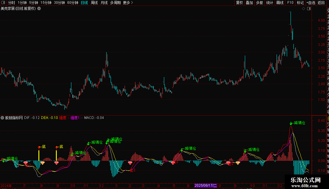 这是一个基于MACD的复合指标,主要用于识别趋势强度、买卖信号和背离形态。