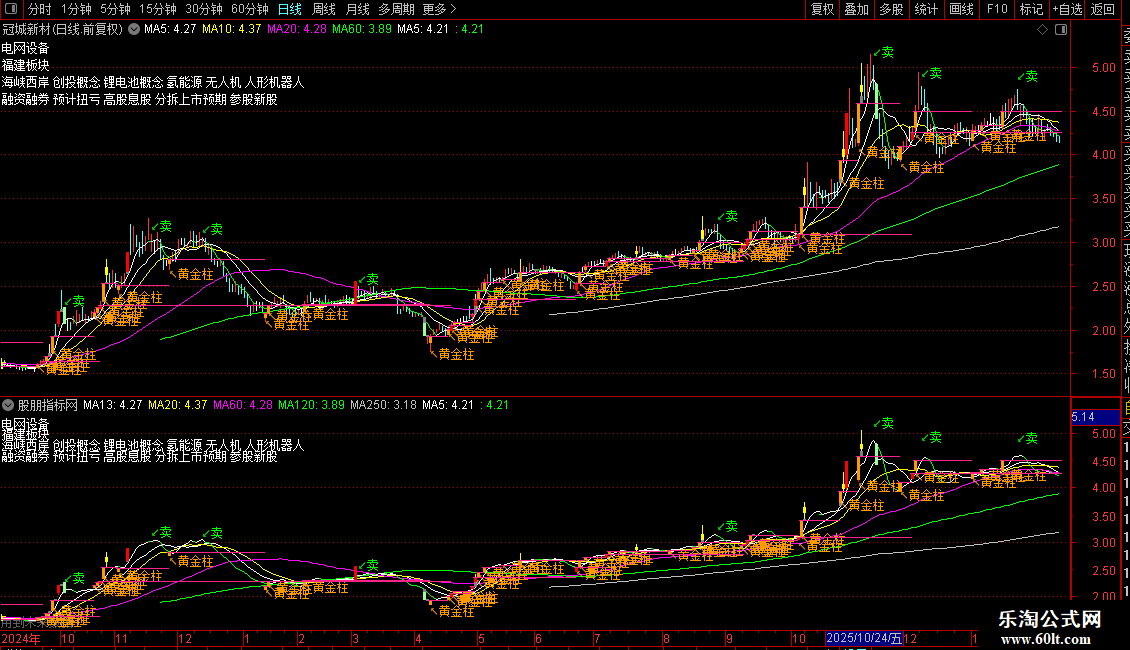 1. 多周期均线:显示13、20、60、120、250日等多条均线,并标注5日均线,当其下跌时显示为绿色。