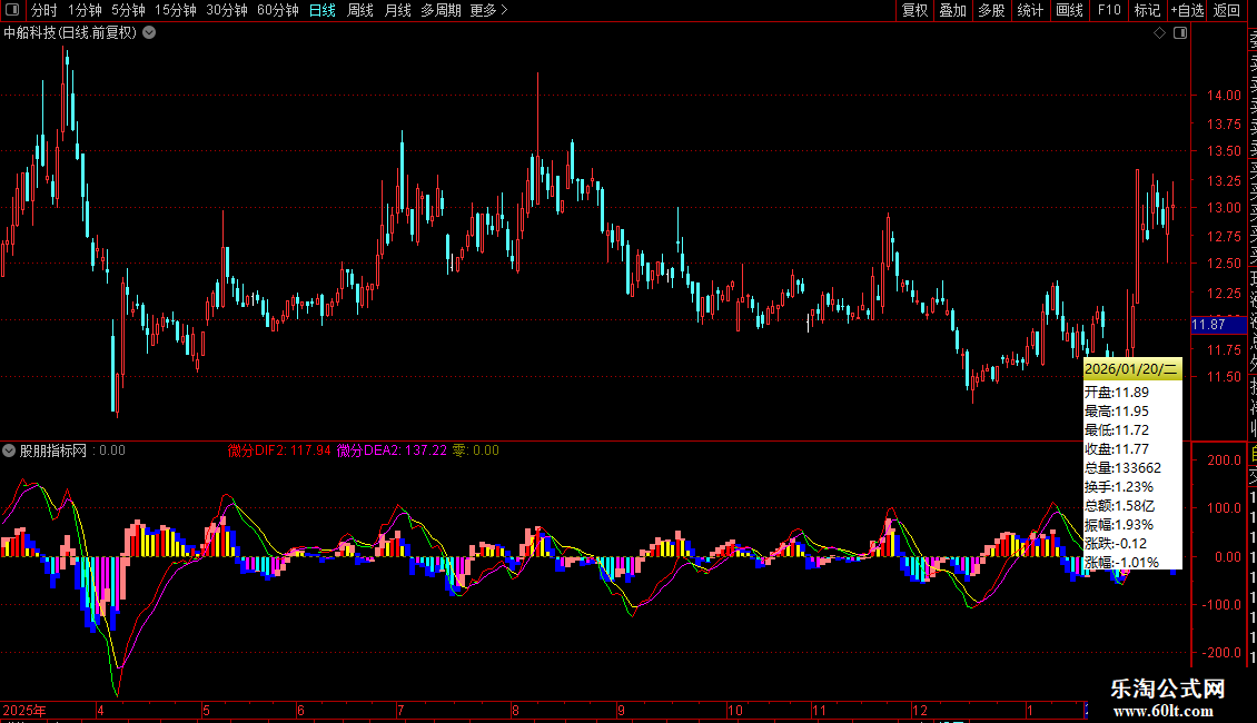 1. 核心部分:基于MACD原理构建的“微分”系统,包含DIF和DEA两条快慢线,以及柱状图(MACD2)。柱状图用四种颜色区分涨跌状态。
