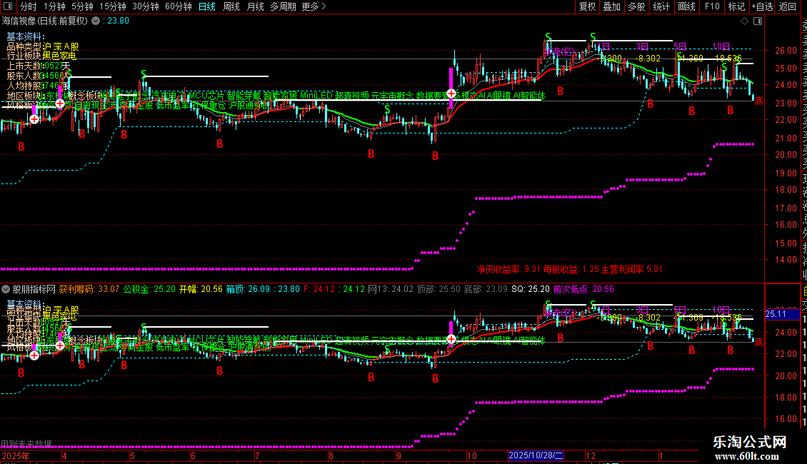 指标为主图叠加指标。加载后,K线图区域将叠加均线、箱体线、买卖点图标和过峰提示。图表四周固定位置会显示股票的基本资料、财务数据和资金流信息,方便用户在进行技术分析时同步查阅基本面情况。