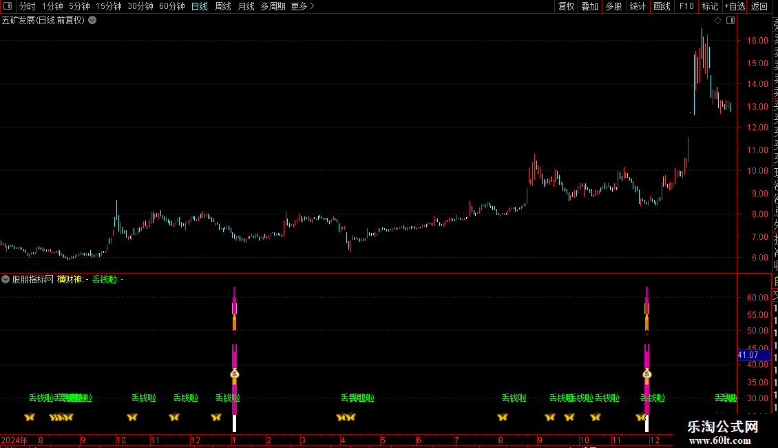 1. 信号解读:“财宝”区域表示市场进入一个综合性的超卖状态。“丢钱啦”信号则是在此超卖区域内,提示短期动能可能发生向上转折的时点。