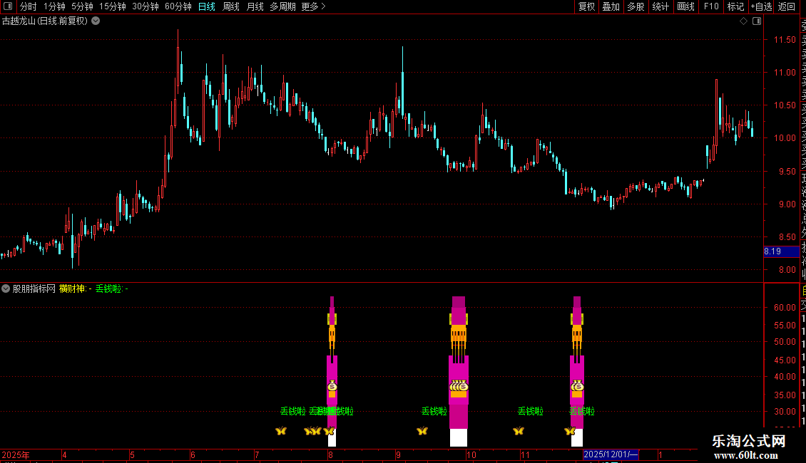 “元宝/丢钱啦”信号:在“财宝”的背景下,当快速随机指标(J11)在低位形成特定形态(X)并开始拐头向上时触发。该信号会标记为“丢钱啦”文字和图标,提示可能的转折点。