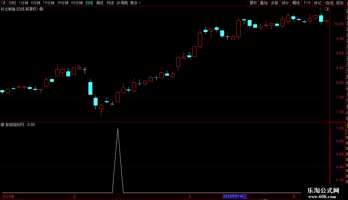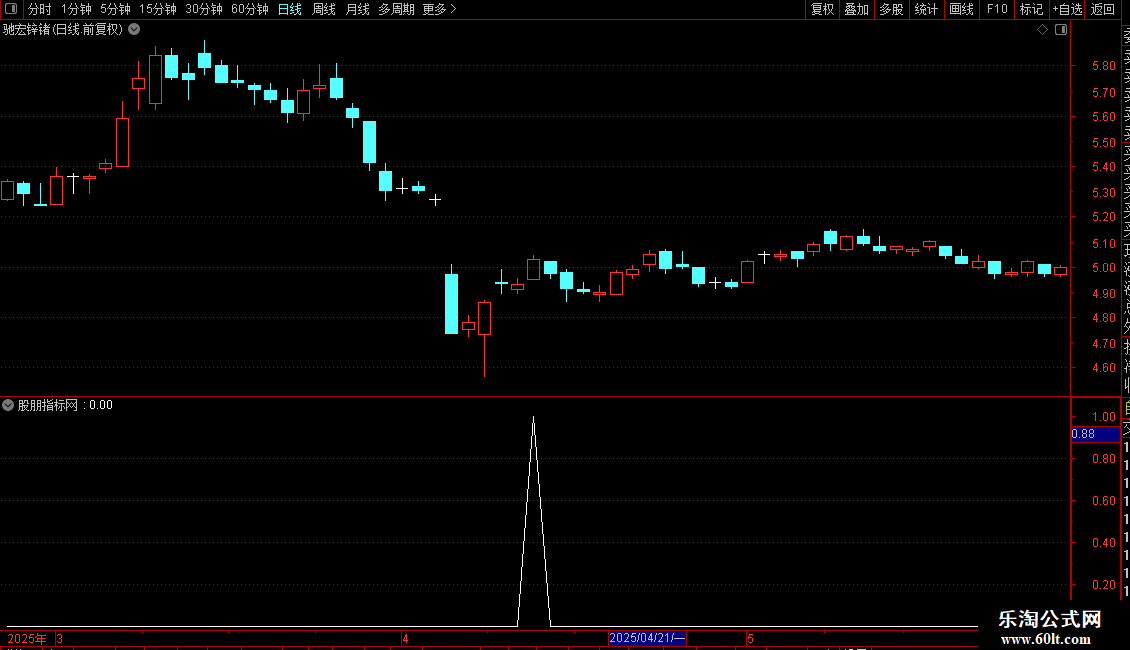 指标通过计算5、15、30日三条均线的相对位置关系,来识别短期趋势的潜在转折点。它主要包含两个信号逻辑:一是利用均线差值比率(LSL)的特定变化模式(如小于-5且近期出现特定拐点)来捕捉超卖反弹机会;二是结合一个辅助条件(AD)来过滤信号,旨在提高信号的可靠性。指标在图表上特定位置(第129根K线处)会标记一个黄色文本作为参考点。整体上,这是一个用于寻找短期均线系统背离后可能产生买入时机的趋势类指标。