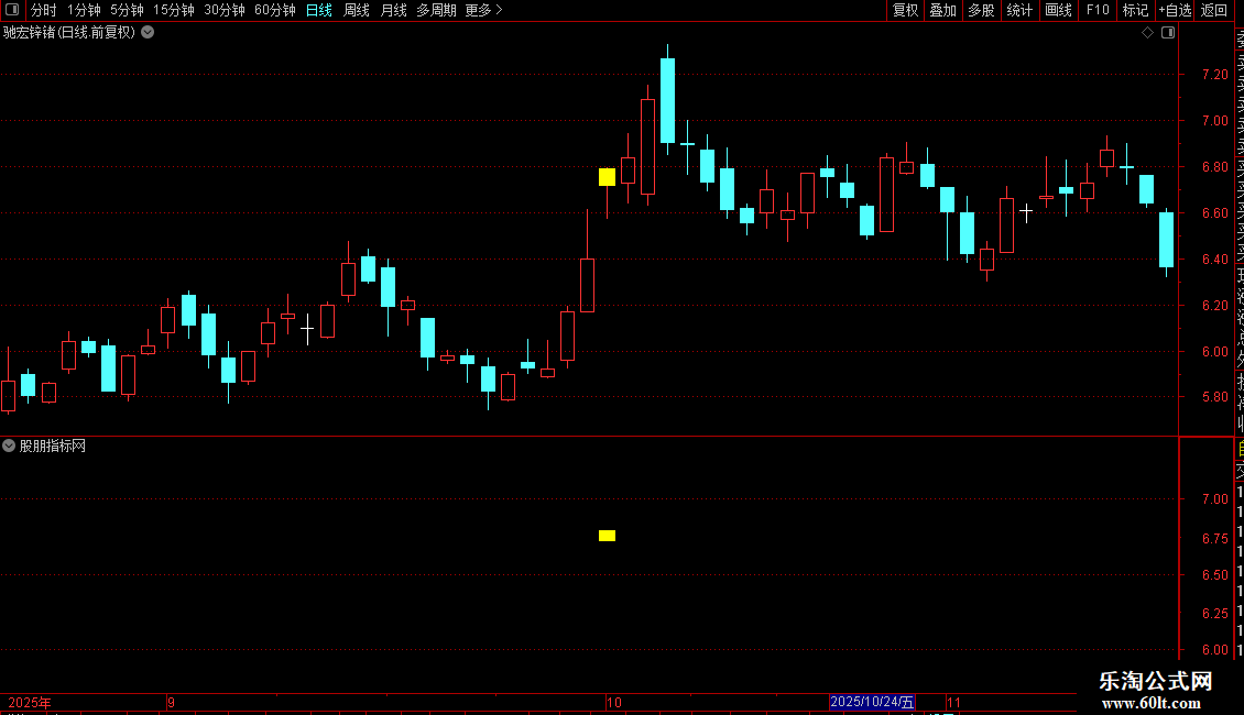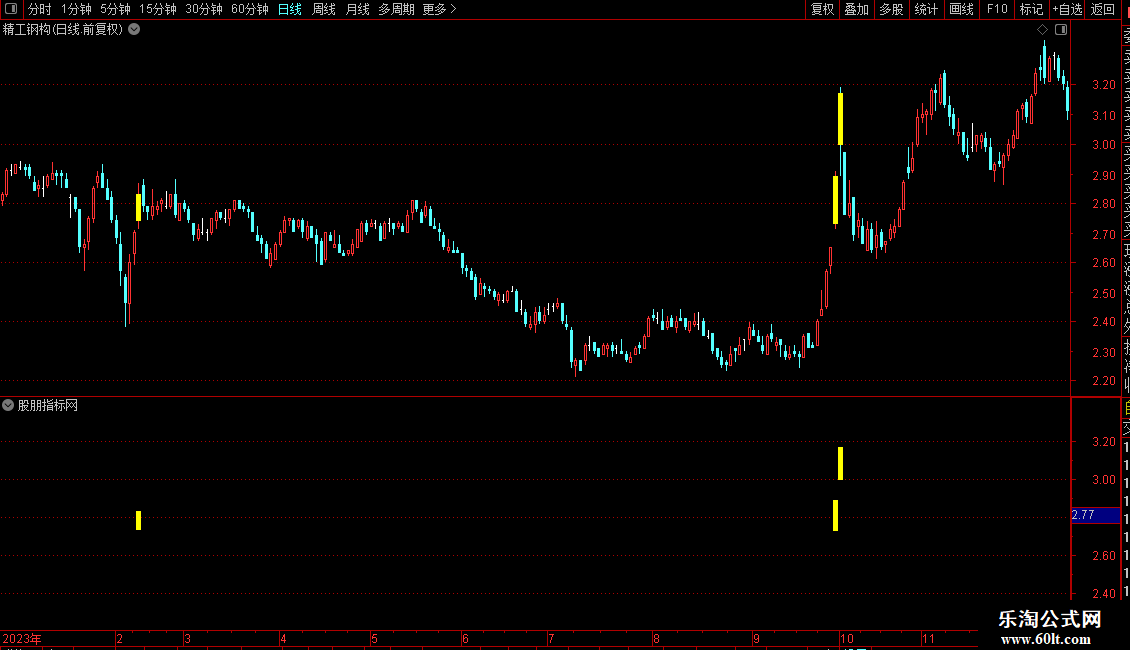 - 加载至副图后,可在符合条件的K线上看到高亮柱状标记,辅助判断短期强势走势。