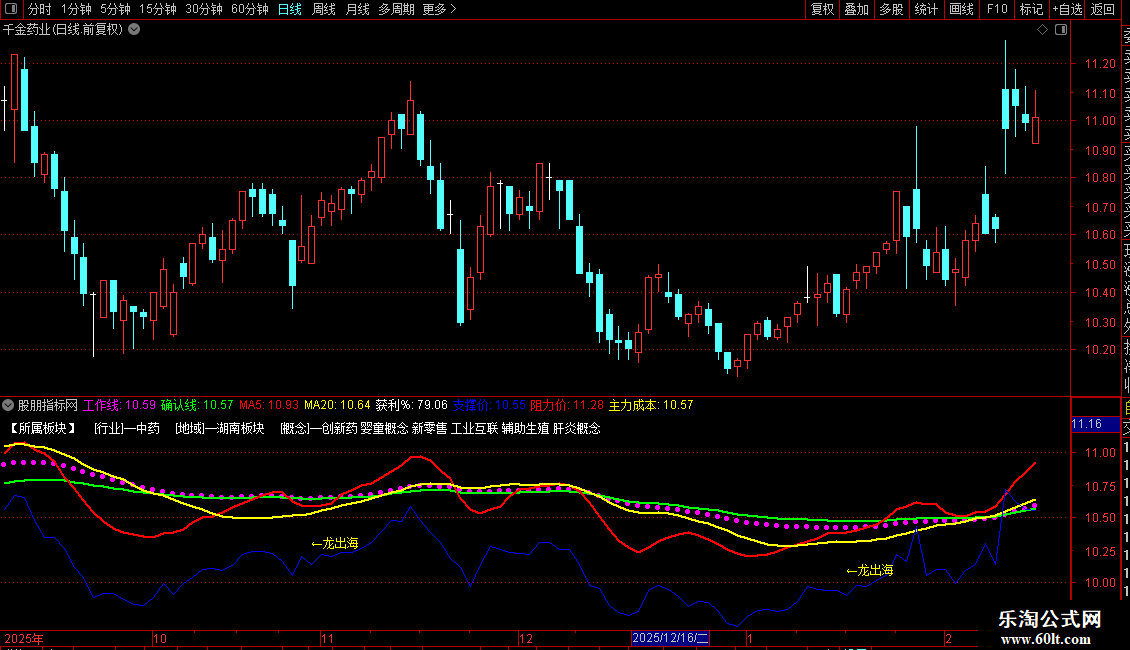 使用要点:指标集成了趋势跟踪、成本分析、买卖点参考和异动K线标识。使用者可结合蓝色涨停中枢线观察强势股回调位置,利用均线系统判断多空趋势,并参考“龙出海”等信号寻找潜在介入时机。各类支撑、阻力、买点价格可作为交易决策的辅助参考。
