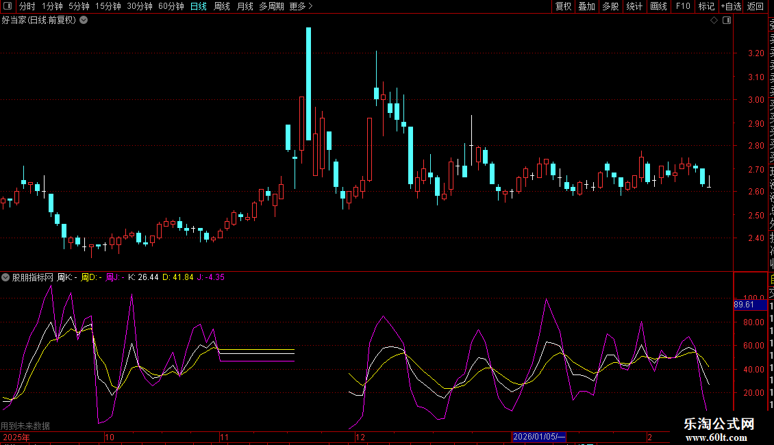 - 叠加显示周KDJ指标,默认从倒数第61根K线开始显示,持续50个周期。