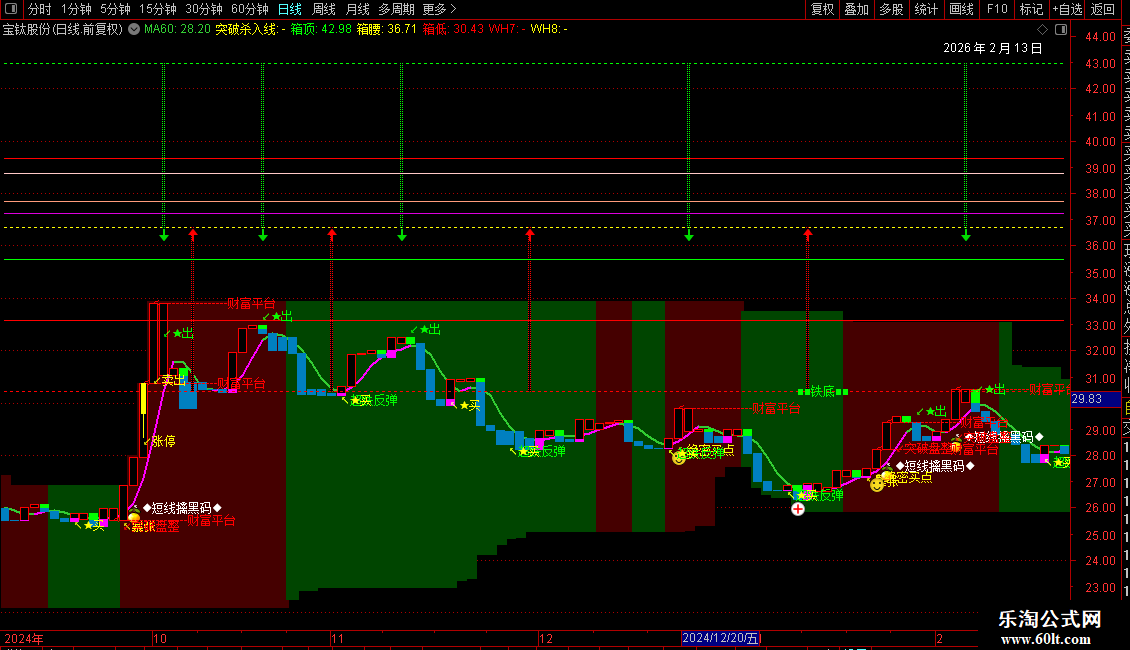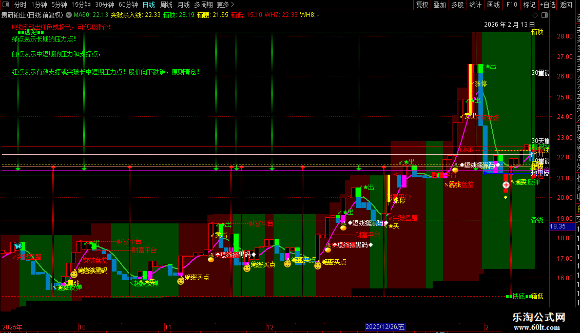 指标信号繁多,覆盖了趋势、形态、支撑阻力、量价等多个维度。使用者应重点关注多信号共振的区域(例如,关键价位线、箱体边界与买卖信号重合),并结合价格实际走势进行判断,避免单一信号带来的误导。指标中的文字注释(如K线底部出红色可低吸)提供了基本的操作思路参考。
