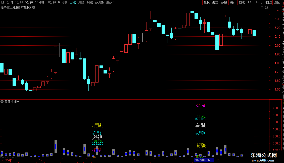 2. 黄金分割:自动识别波段的高低点,并绘制出多个关键黄金分割位(如0.191、0.382、0.618等),以彩色带状区域和具体数值显示。
