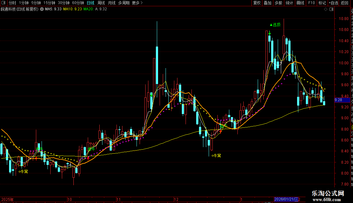 指标会在主图K线上绘制文字(如“追牛”、“逃顶”)和图标来直观标记信号点。