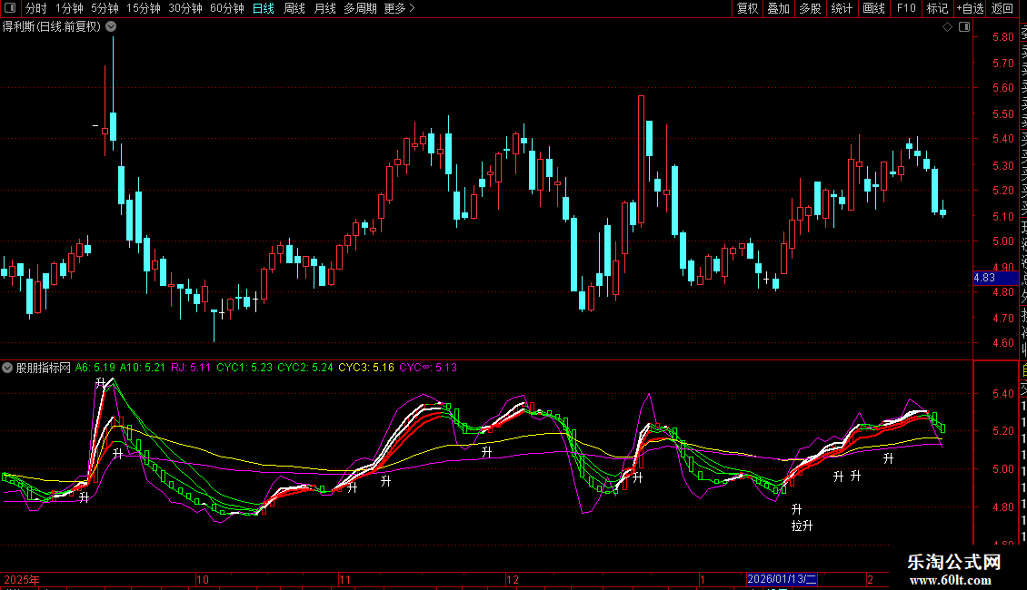 副图:用于观察股价与各条均线、成本均线的相对位置关系,以及“升”/“拉升”信号的出现,辅助判断趋势和入场时机。
