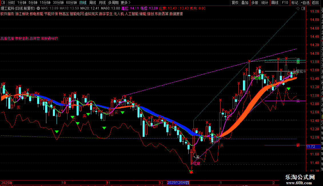 资金分析:通过K线颜色(红/青)和细分(紫/绿)展示机构、大户资金的流入流出状态,并用特殊K线标记主力资金累计值上穿/下穿均线的信号。