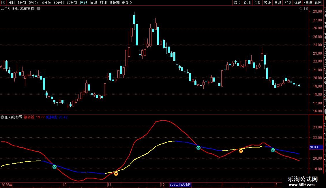卖出信号:当乾坤线向上穿过绝密线时,在乾坤线位置显示卖出图标。