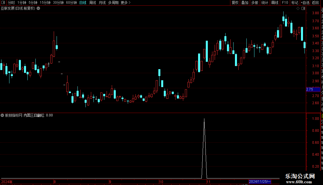 - 当“内困三日翻红”条件成立时,指标标记买进信号。