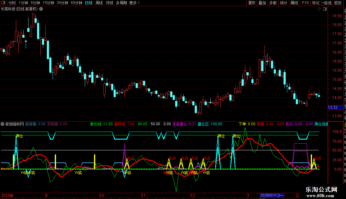 “股价线”在0-100区间波动,可直观判断股价在通道内的高低位置。