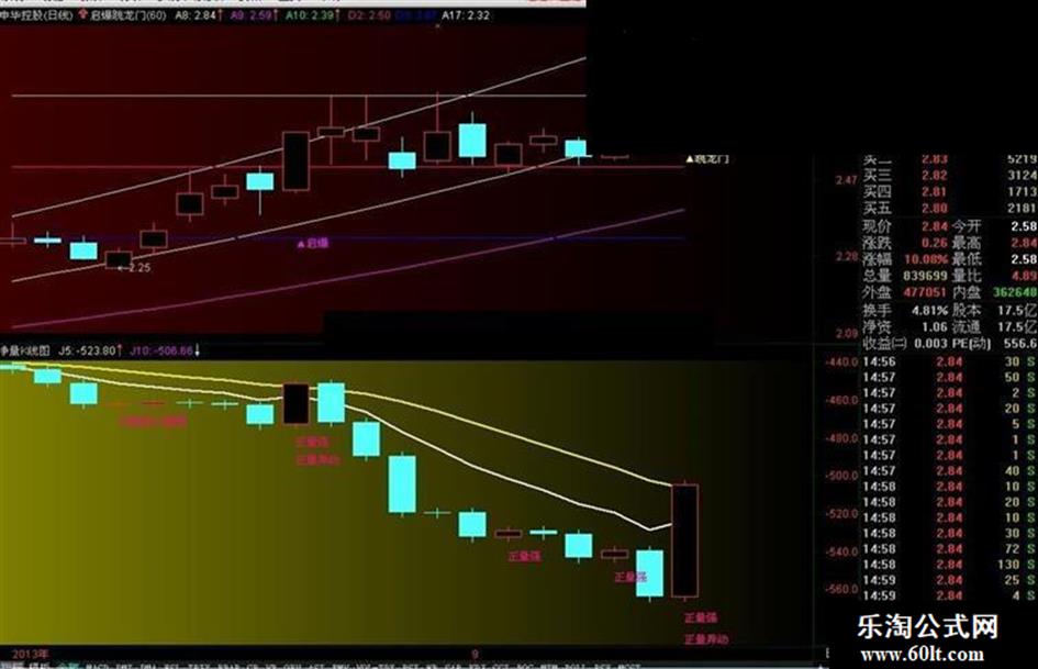 DRAWTEXT(CROSS(J2,J5) AND CROSS(J2,J10),REF(J2,1)*1.04,'正量异动'),COLORLIMAGENTA;