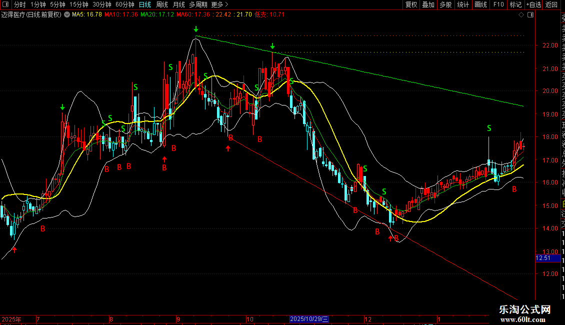 通过“顶”和“底”线构成BBI布林通道,标识价格波动范围。