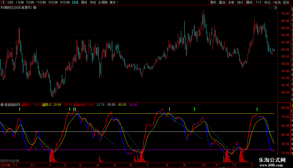 2. 反弹信号:绿色箭头标记超跌反弹买点(需满足K上穿D、乖离率<-6等条件)。