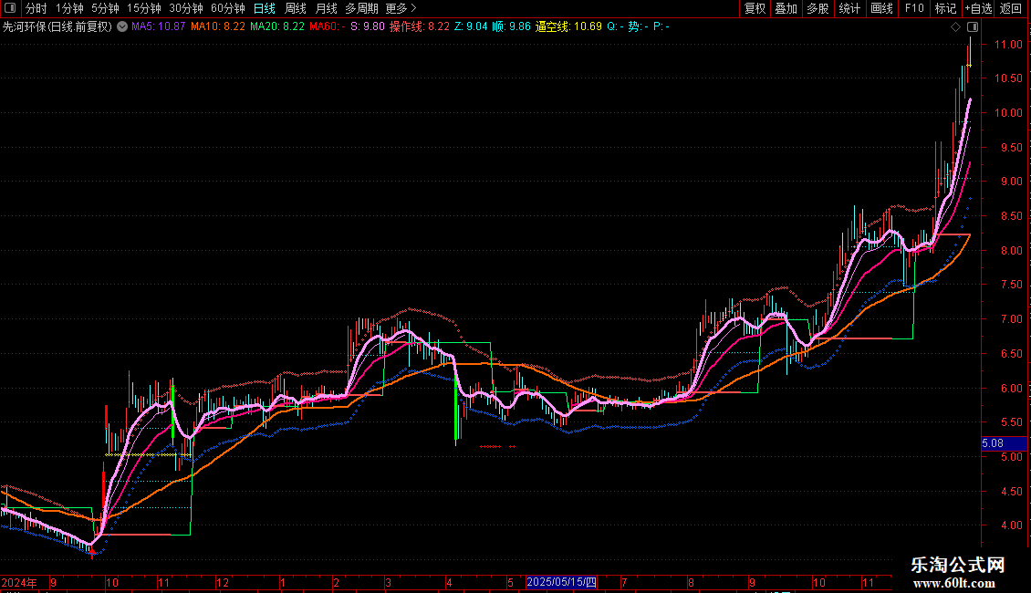 势:IF(H>=REF(A0,BARSLAST(CROSS(A1X,0)))*1.5,REF(A0,BARSLAST(CROSS(A1X,0)))*1.5,DRAWNULL),COLORCYAN,POINTDOT;