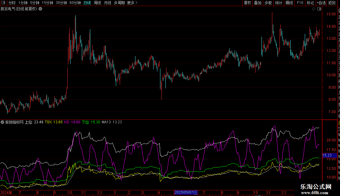 `TSX`(即 `X1`)为核心动态线,结合 `KD` 线、`MA13` 判断趋势方向与强度。