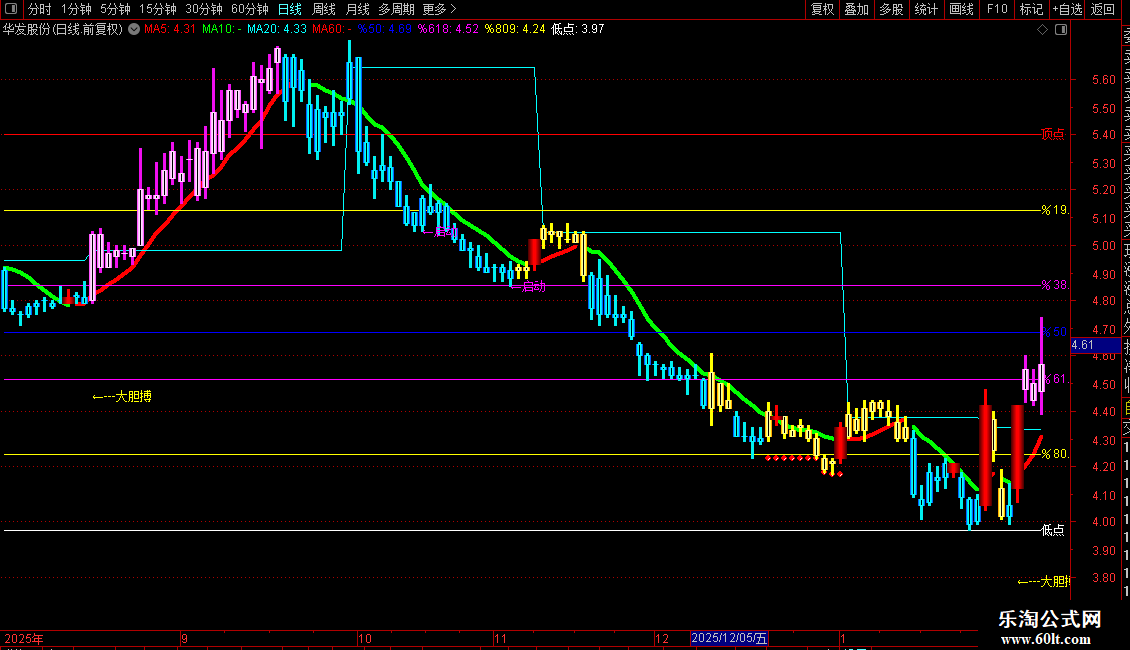 计算最近N(默认80)个周期内的最高价(高)与最低价(低),并以此区间为基准,绘制出19.1%、38.2%、50%、61.8%、80.9% 五条斐波那契回调线,连同“顶点”(区间高点)和“低点”(区间低点)一起,作为重要的支撑阻力位参考。这些水平线在图上以不同颜色标注。
