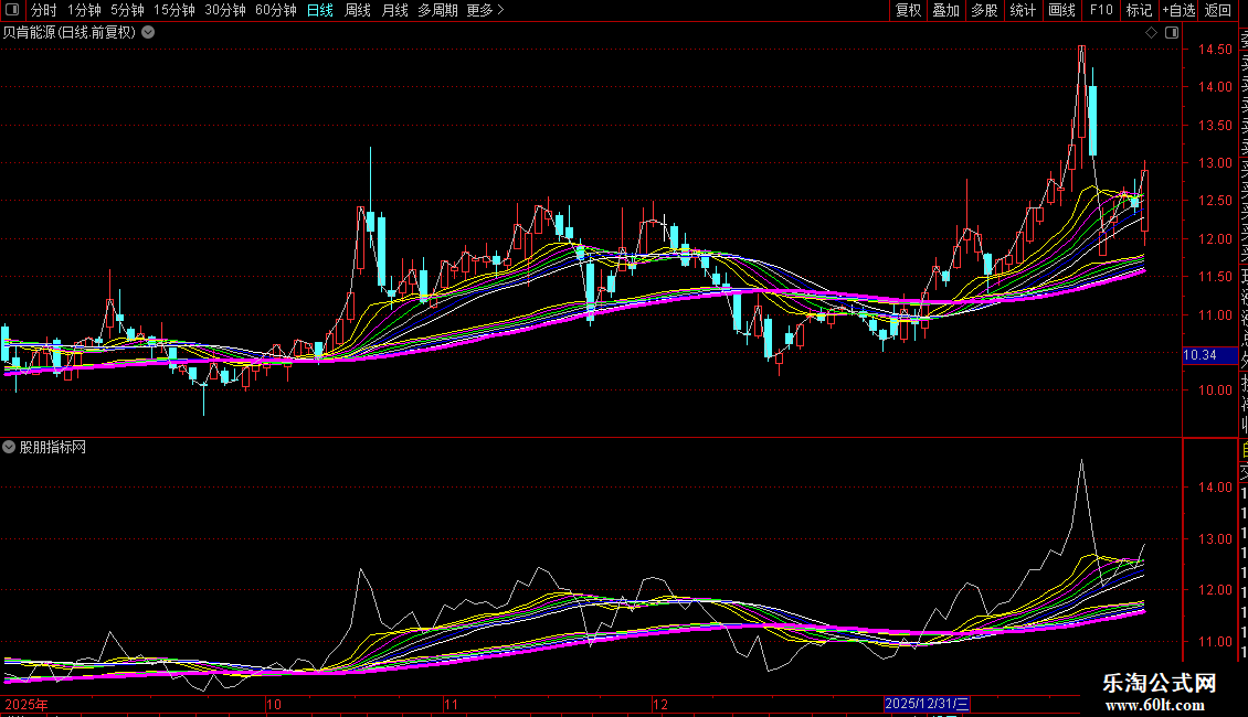 NOTEXT14(EMA60的13周期均线)为品红色粗线。