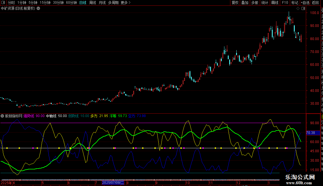 强势线(90)、中轴线(50)、弱势线(10):三条水平参考线,用于界定能量数值所处的强弱区域。