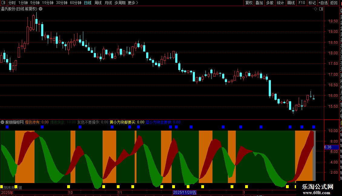 3. 灰色柱状带(COLOR666666):当既非`UP`也非`DOWN`条件时显示,表示“灰色不要操作”状态。这通常发生在均线交叉后的初期,趋势方向尚未被`DRAWLINE`函数明确画出(即说明中提到的“灰色区”)。此时价格可能高走、平走或低走,方向不明,应空仓观望。