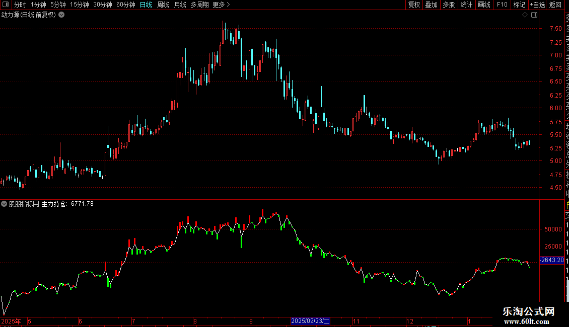 STICKLINE(DT<0,主力持仓+DT,主力持仓,1,0),COLOR00FF00;