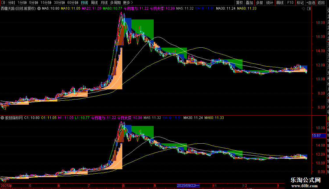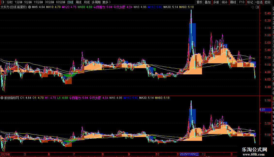 今日阻力:IF(ISLASTBAR,REF(明日阻力,1),DRAWNULL),POINTDOT,LINETHICK4,COLORMAGENTA;