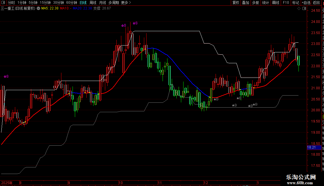 A:=AMOUNT/V/100;VARA:=EMA((((A-EMA(A,13))/EMA(A,13))*(0-100)),5);操盘线:=EMA(((VARA/10)+EMA(A,10)),3);行情线:=EMA(A,3);重心:= (C+0.618*REF(C,1)+0.382*REF(C,2)+0.236*REF(C,3)+0.146*REF(C,4))/2.382;趋势线:EMA(((SLOPE(C,22)*20)+C),55),COLORYELLOW,LINETHICK2;红升:IF(重心>=趋势线,趋势线,DRAWNULL),COLORRED,LINETHICK2;蓝降:IF(重心<趋势线,趋势线,DRAWNULL),COLORBLUE,LINETHICK2;STICKLINE(行情线<操盘线,H,L,0,1),COLORGREEN;STICKLINE(行情线<操盘线,C,O,2,1),COLORGREEN;STICKLINE(行情线>=操盘线,H,L,0,1),COLORRED; STICKLINE(行情线>=操盘线,C,O,2,1),COLORRED;压力:MA(REF(HHV(C,30),1),2),COLORWHITE;支撑:MA(REF(LLV(C,30),1),2),COLORGRAY; DA:=(EMA(C,1)+EMA(C,2)+EMA(C,3)+EMA(C,4))/4;DB:= (EMA(C,10)+EMA(C,20)+EMA(C,40)+EMA(C,80))/4;DRAWTEXT(CROSS(DA- DB,0),L*0.98,'★B'),COLORGRAY;JH:=SMA(MAX(C-REF(C,1),0),5,1)/SMA(ABS(C- REF(C,1)),5,1)*100;DRAWTEXT(CROSS(84,JH),H*1.02,'☆S'),COLORMAGENTA;涨停:=IF((C-REF(C,1))*100/REF(C,1)>=(10-0.01*100/REF(C,1)),1,0); STICKLINE(涨停,O,C,2,0),COLORRED;跌停:=IF((REF(C,1)-C)*100/REF(C,1)>= (10-0.01*100/REF(C,1)),1,0);STICKLINE(跌停,O,C,2,1),COLORGREEN;