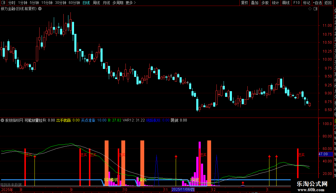 绝路航标:IF(CROSS(B,VAR12) AND B<40,50,0);