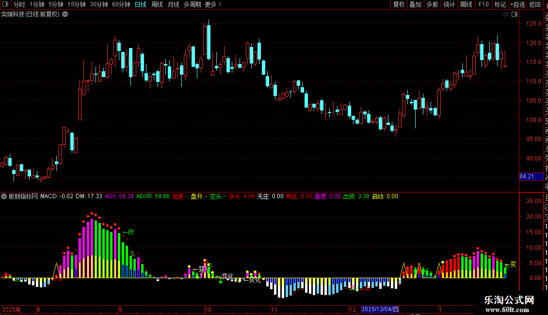 多头:IF(DM>0 AND ADXR<REF(ADXR,1),控盘*1.2,DRAWNULL),CROSSDOT,COLORRED;