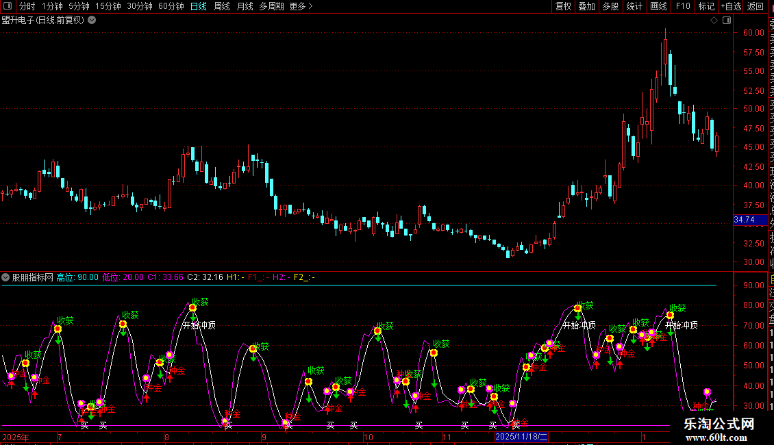 DRAWTEXT(CROSS(C2,C1),REF(C1,1),'收获'),COLORGREEN;
