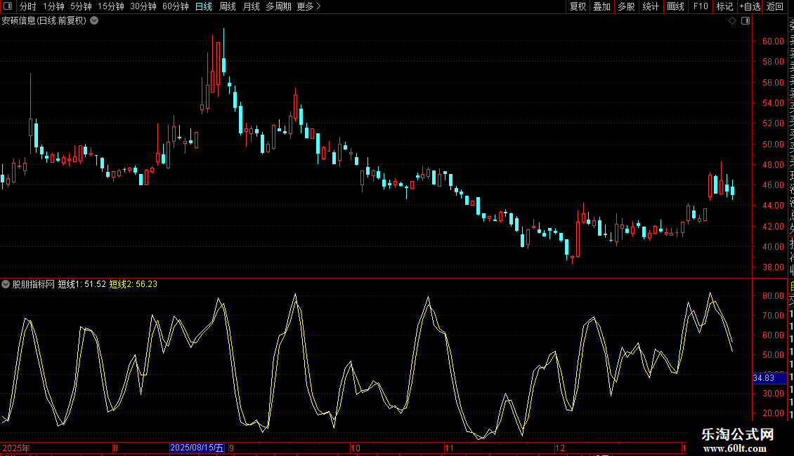 当白线从下向上穿过黄线,且两者的交叉点小于35的时候,尾盘跟进。