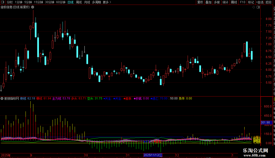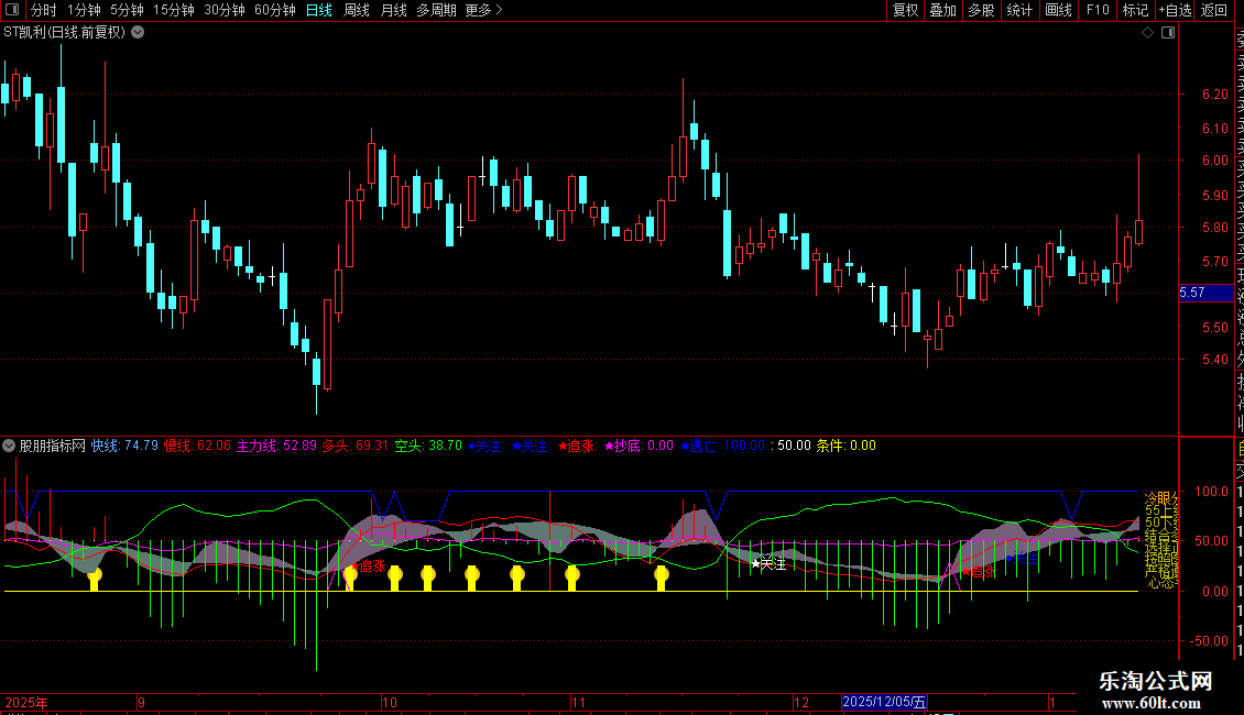 ●关注: DRAWTEXT(REF(CROSS(空头,慢线),25) AND 空头>1.005*慢线,慢线,'●关注'),COLORBLUE,LINETHICK1;