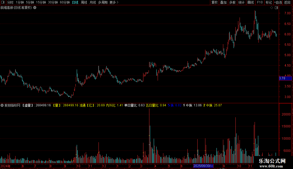 〖虚量〗:IF(CURRBARSCOUNT=1 AND PERIOD=5,VOL*240/FROMOPEN,DRAWNULL),NODRAW;