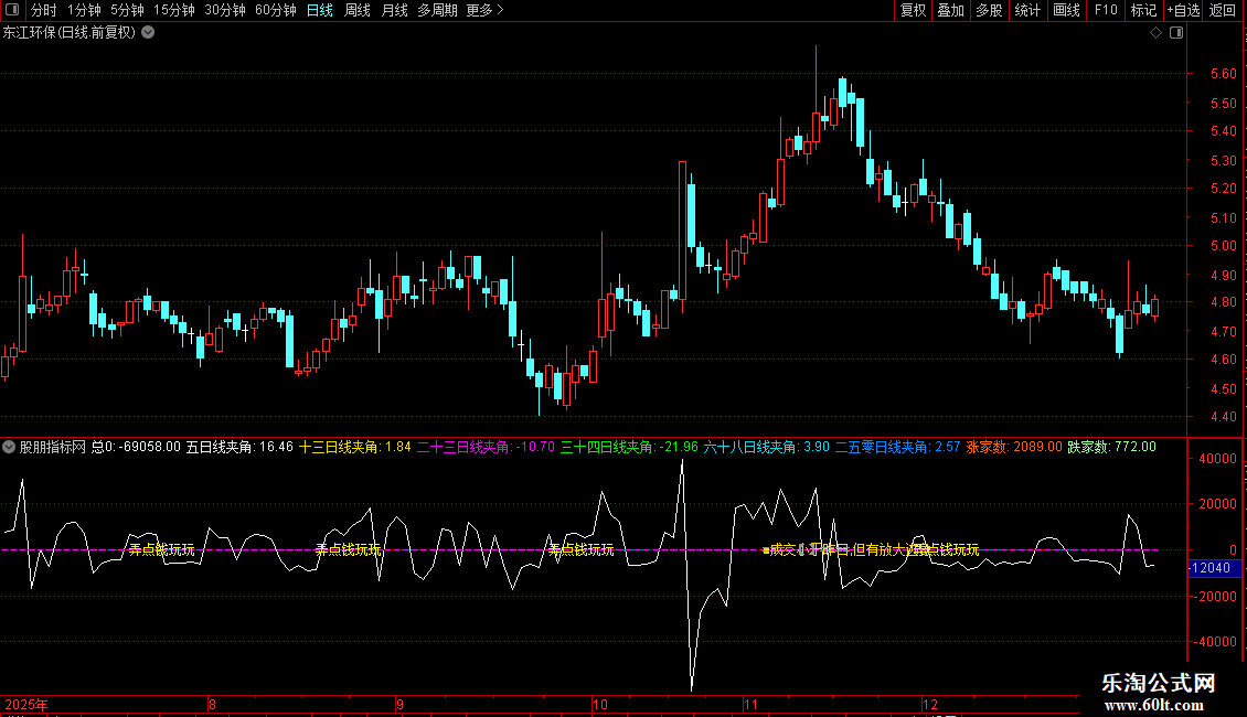 五日线夹角:ATAN((MA(C,5)/REF(MA(C,5),1)-1)*100)*57.3,COLOREEEEEE,NODRAW;