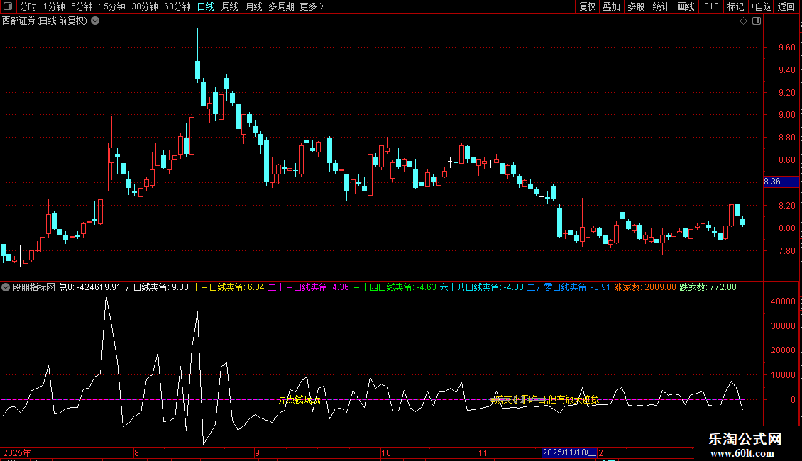 二十三日线夹角:ATAN((MA(C,23)/REF(MA(C,23),1)-1)*100)*57.3,COLOREE00EE,NODRAW;
