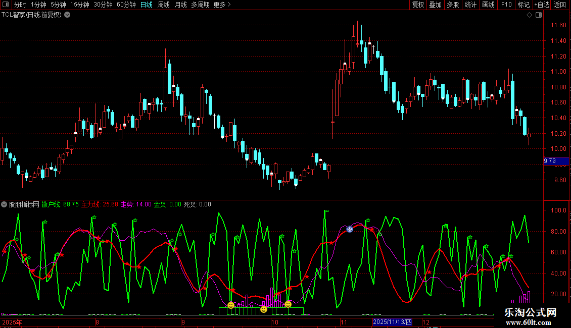 DRAWTEXT(死叉,散户线,'☆'),COLOR00F300;