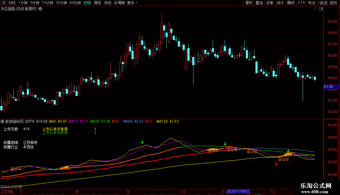 DRAWTEXT(COUNT(CROSS(MA5,MA10),21)>1 AND CROSS(MA5,MA10),L,'金山谷'),COLOR1788FF;