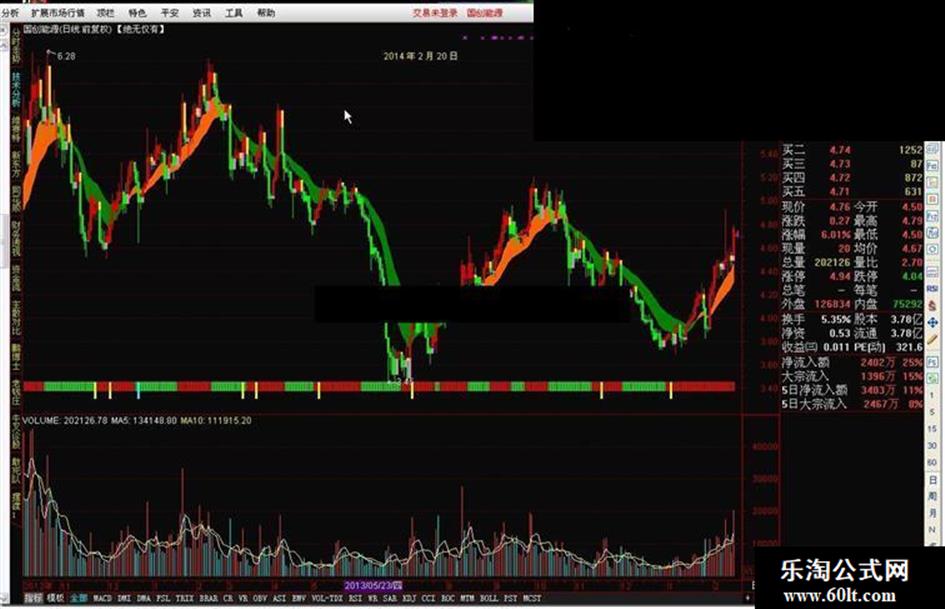 多空趋势彩带:DRAWBAND(SMA(C,6.5,1),RGB(255,97,0),SMA(C,13.5,1),RGB(0,128,0));