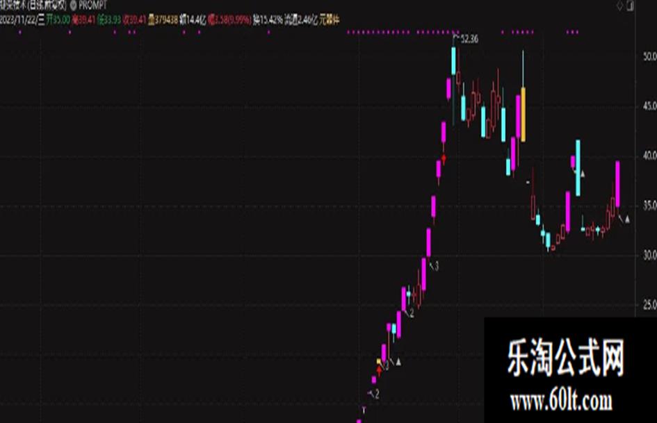 X2:=FILTER(V2-P2>=2,GL2);{个股30个交易日内涨幅偏离值>=200%}{其后6或11个交易日不再显示该异动}